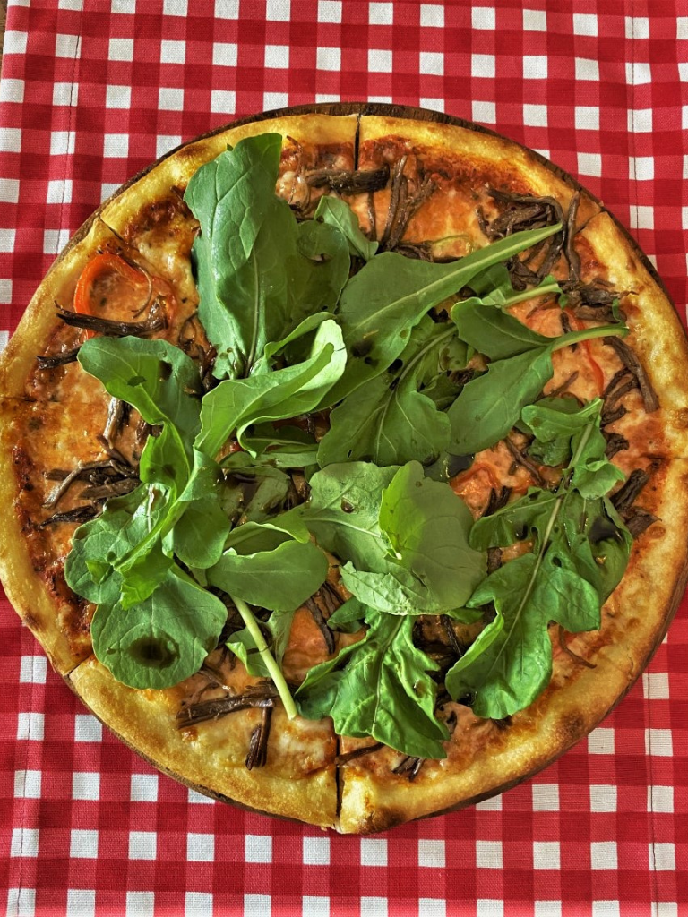 Spizzala Domates Sosu, Mozzarella, 18 Saat Marine Edilmiş Tiftik Dana Eti, Kapya ve Köy Biberi, Roka, Balzemik Sosu